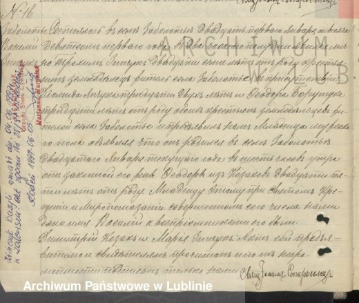 Działo się we wsi Zabłocie dwudziestego pierwszego stycznia tysiąc dziewięćset pierwszego roku o drugiej godzinie po południu stawił się Trochim Zynczuk mający lat dwadzieścia siedem rolnik mieszkaniec wsi Zabłocie w obecności Diomida Janczuka trzydzieści dwa lata i Teodora Boruszuka trzydzieści lat mających obydwaj rolnicy mieszkańcy wsi Zabłocie i przedstawił nam dziecko męskiej płci oświadczając że… Czytaj dalej ZIŃCZUK