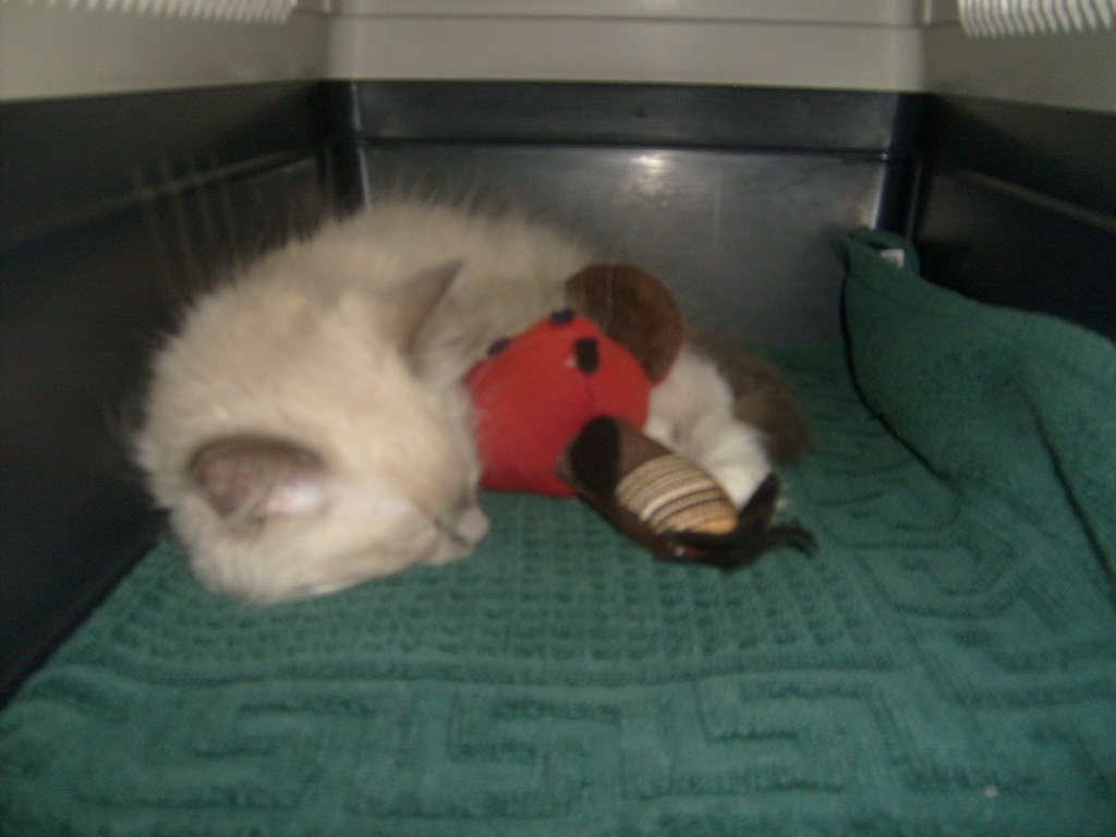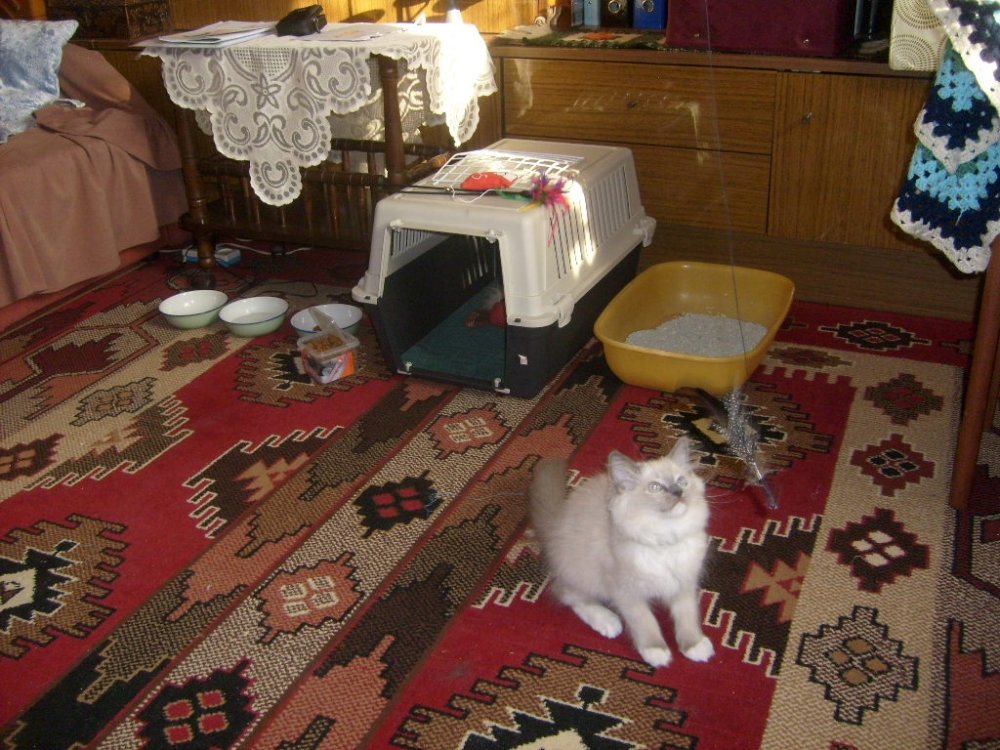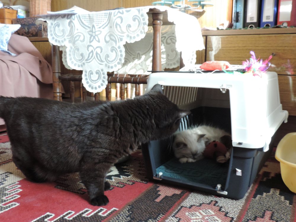 W drzwiach przywitała nas Fifi. Nie spodziewała się takiego gościa, ale jakoś powstrzymała się od wszelkich niegrzeczności. Nie potrwało to jednak długo. Fifi nie mogła powstrzymać się od miseczki przeznaczonej dla gościa i korzystając z mojej nieuwagi dokładnie ją opróżniła. No i jeszcze cały dzisiejszy wieczór przesiedziała w drzwiach pokoju z gościem mając go na oku. Dwa razy, gdy gość spał zajrzała do jego sypialni, którym był jeszcze jej transporterek.
