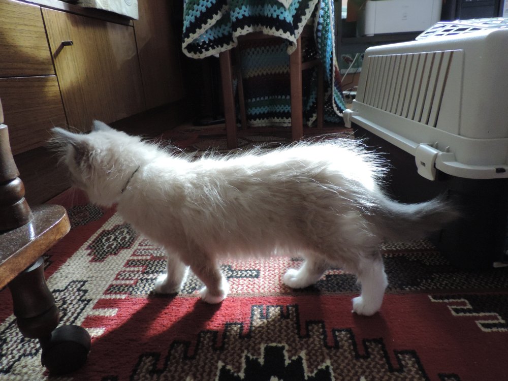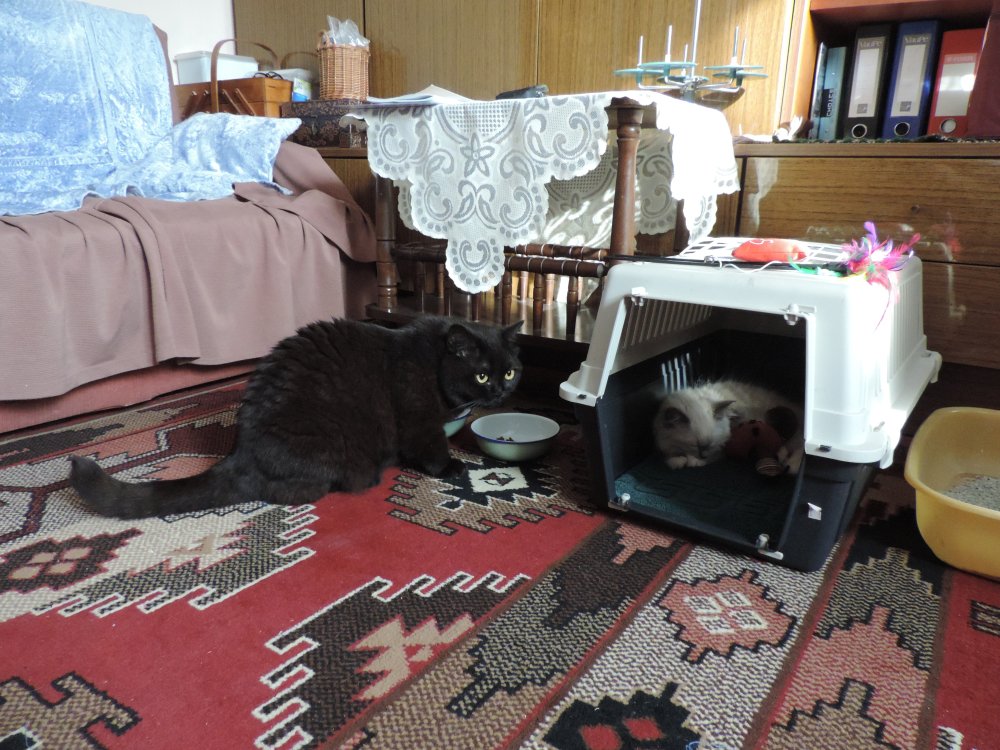 Druga noc podobna do pierwszej. Fifi znów czatowała przy drzwiach. Nim się wszyscy pobudzili doszło do niespodziewanych wizyt. Oto Fifi zdecydowała się nawiedzić apartament Fiony. Fiona schowała się pod łóżko i tylko filowała, co Fifi będzie robić. A ta dokładnie obwąchała dywan, krzesło, kanapę, toaletę, miseczkę – ale niczego nie ruszyła. Obeszła dookoła Fionę łypiąc na nią okiem i spokojnie wyszła biorąc azymut na swój apartament. Widziałam, że schowała się w wersalkę – odkąd do nas przyjeżdża zawsze tam się ukrywa.