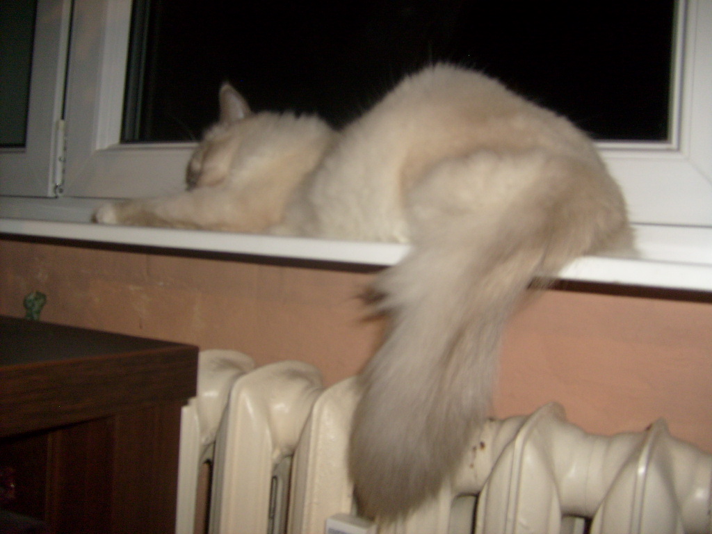 Fiona je i rośnie. Trudno to nazwać jedzeniem. Ona po prostu wymiata. Przez tydzień wpałaszowała prawie wszystkie Cosmy, które przywiozła ze sobą z Wrocławia. Dokupiłam jej na kilka dni Whiskasa i Felixa, zanim zorganizuję jej coś z Internetu. Nie było nic innego dla juniorów. Nie wybrzydzała – zmiotła Whiskasa i jeszcze poprawiła Felixem. Jak tak dalej będzie – to będzie szersza niż dłuższa, ale może się opamięta. Może to pełna miska Fifi tak ją nęci, że z zazdrości wcina, co tylko ma pod nosem. Nawet bułki z masłem posmakowała. Waży 1,3 kilograma. Dachówka Syrenka tyle ważyła, gdy nam ją podrzucono, a miała wtedy 1,5 roku. Niewątpliwie Ragdolle są większe, ale Fiona chyba będzie super babą.