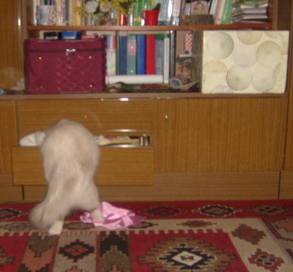 Przez cały tydzień, jak tylko nie było nikogo z nas w domu Fiona siedziała sama w swoim apartamencie. Fifi zaś urzędowała w całym domu, ale najbardziej skupiała się nad drzwiami Fiony. Może zastanawiała się dlaczego ciągle były zamknięte? Na dzisiejszą noc i Fionie daliśmy nieograniczoną wolność. Udało się. Żadnego darcia kotów nie było. Może już się dogadały na zasadzie „co wolno wojewodzie…”