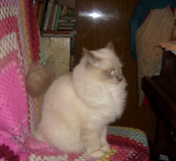 Co się okazało? Bawiła się wędkami w pobliżu bujanego fotela. Jedna z nich w jakiś sposób zakręciła się wokół jej szyi i zaczepiła się o ten fotel. Czy koty bawiły się na tym fotelu? Trudno sobie wyobrazić, jak do tego doszło. Szczęście, że żyje.