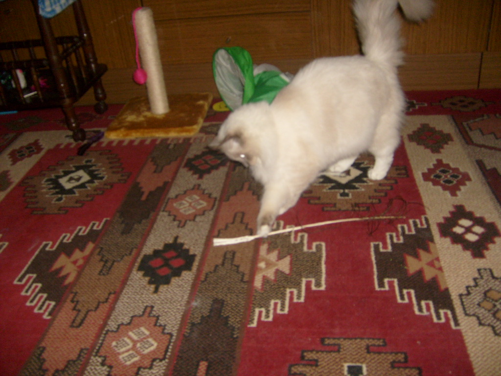 Żadne tam gęsie, strusie, czy nawet pawie piórko na wędce nie sprawia Fionie takiej radochy jak zwykły biały koralik. Mogłaby ganiać za nim cały dzień, ale … tusza. No cóż. Waży już trzy kilogramy. Na apetyt nie narzeka. Wszystko co z torebki jest pyszne. No, może trochę mniej lubi ryby, ale głód zamyka oczy i nos, więc i ryby z miseczki powoli znikają. Kupiłam jej przez Internet suchej karmy specjalnie dla Ragdolli – chyba woli jednak tę dla Brytyjczyków. Pewnie jeszcze pamięta fifiną stołówkę. Daję jej dla podtrzymania pamięci o Fifi.
