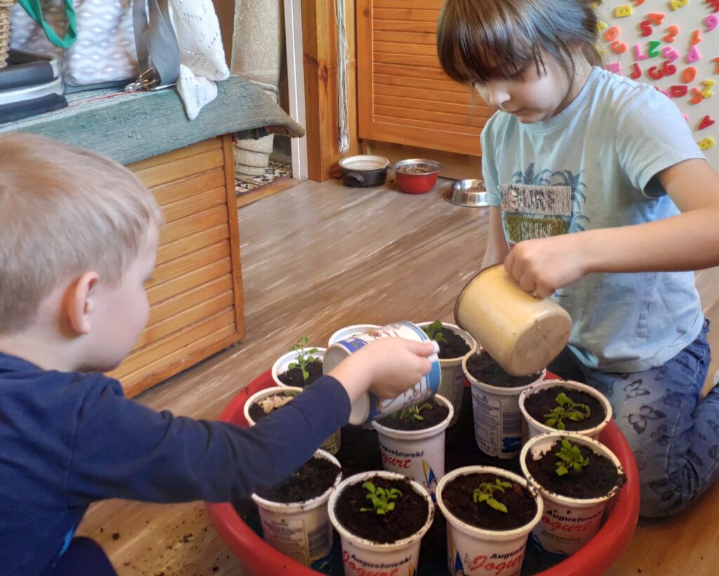 16 stycznia (tytułem próby) wysiałam trochę nasion. Zioła (bazylia, piołun, majeranek i pomidory) nawet ładnie powschodziły; pozostałe tak sobie, a sałata najgorzej. Dzisiaj przepikowałam pomidory Awizo. Mają pierwsze znaleźć się w szklarni. Przy okazji, że były u mnie dzieci, więc przy ich udziale odbyły się zajęcia praktyczne. Ola brała udział w pikowaniu i podlewaniu, ale Stasio to tylko podlewał. Wysiałyśmy z Olą także pomidory Awizo z przeznaczeniem do gruntu i sałatę.