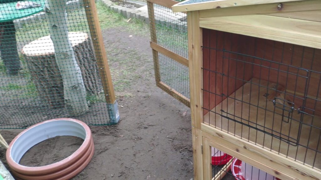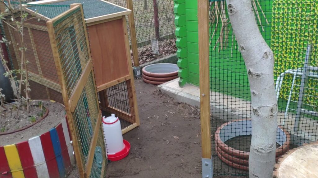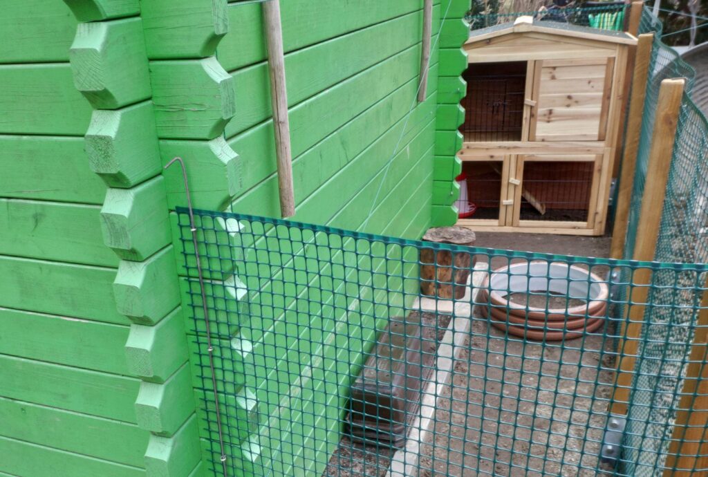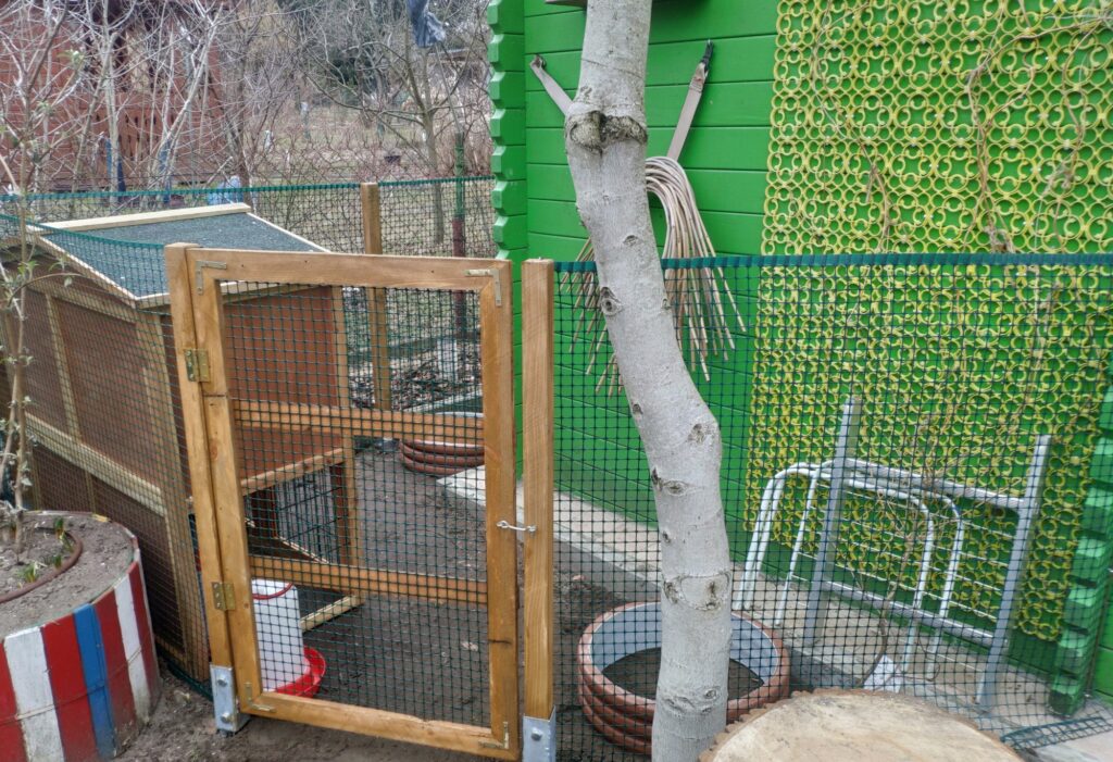 Kurniczek jest już „ogrodzony”. Do drewnianych słupków na metalowych nogach są wkręcone oczka, przez które po naciągnięciu siatki przeciągnięty jest drut. Stosując takie zamocowanie siatki miałam na uwadze łatwiejszy jej demontaż, gdyby zaistniała taka potrzeba. Ogrodzenie jest z zielonej siatki o wysokości 1,0 m o oczkach kwadratowych 20x20mm. 2 rolki siatki firmy Nortene były kupione w Leroy Merlin, nogi do słupków (6 sztuk), śruby i oczka kupione w OBI. Słupki drewniane i drut z odzysku. Wybieg dla kurek nie jest duży. Kurki będą miały dwa grzebaliska z kręgów (piasek i popiół). Będą miały także możliwość wyjść furtką poza ogrodzenie na spacer po ogrodzie.