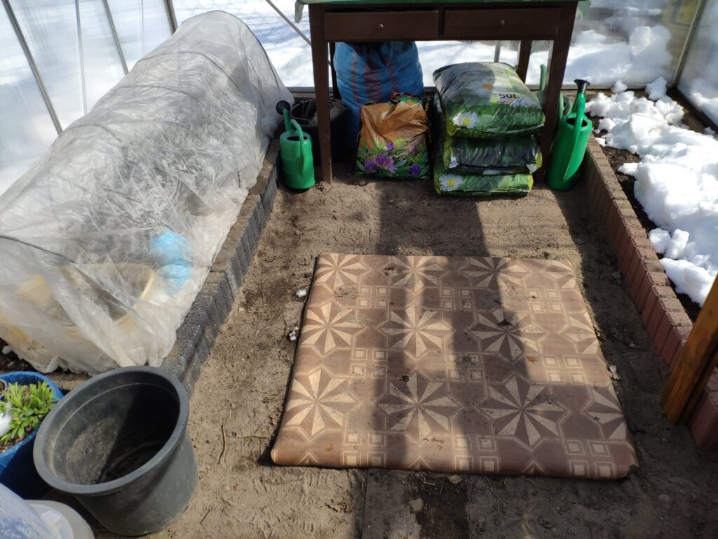 Przy okazji, że tyle jest śniegu, „podlałam” nim grządki podniesione. Jeszcze nie są skończone, ale wody nigdy za wiele. O tych grządkach i o mojej permakulurze w szklarence opowiem, gdy już grządki będą gotowe do pracy. Tymczasem pod agrowłókninę są schowane doniczki z bratkami i z wysianymi nasionami. Jak się nieco ociepli może po prawej stronie posadzę 2-3 krzaczki pomidorów, może jakąś sałatę wysieję itp…