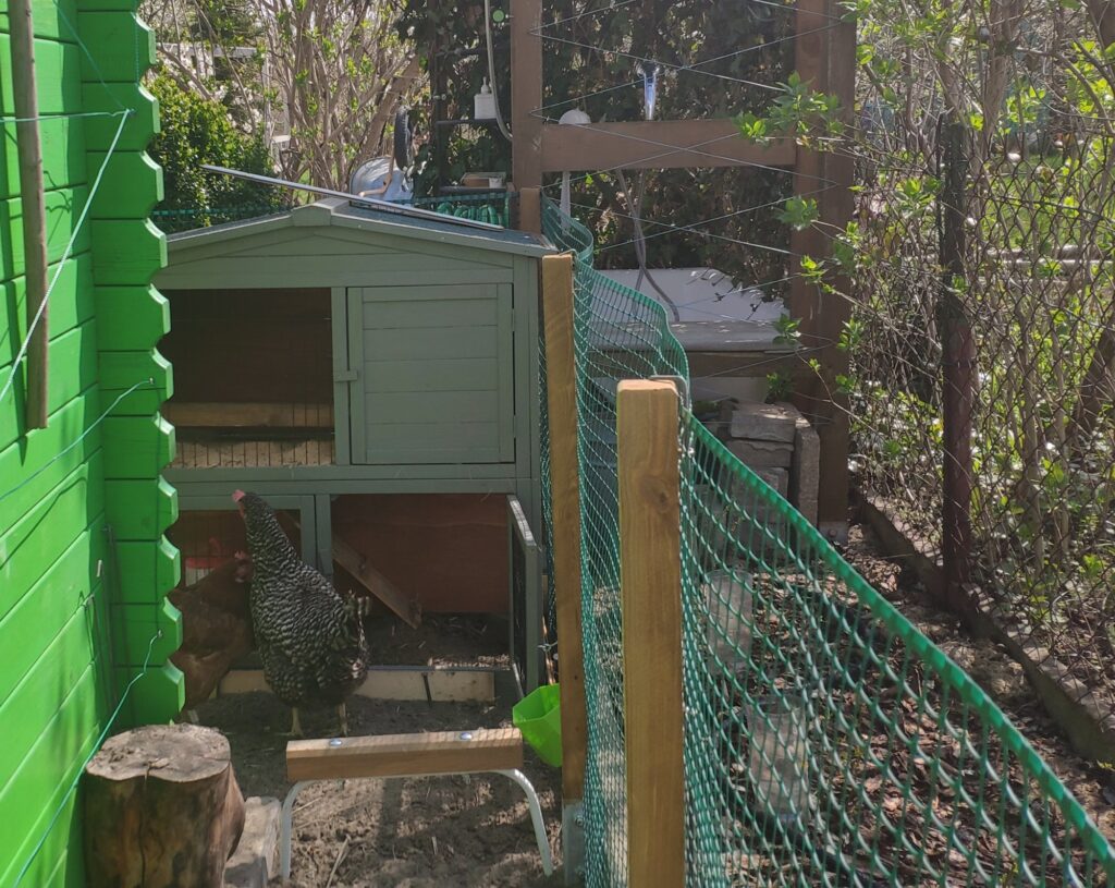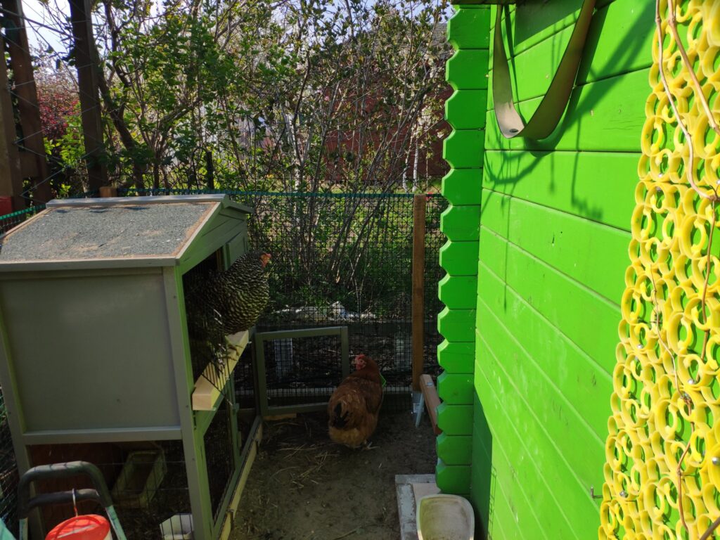 Drugi temat jaki powstał, to próba wychodzenia kurek na warzywnik. Udostępniłam im trochę swojego podwórka, montując parawan z siatki. Nie było odpowiedniej siatki w kolorze czarnym, ani w zielonym – tylko w białym. Jutro będzie montaż. Bardzo jestem ciekawa, czy zda egzamin.