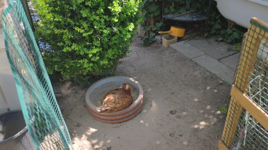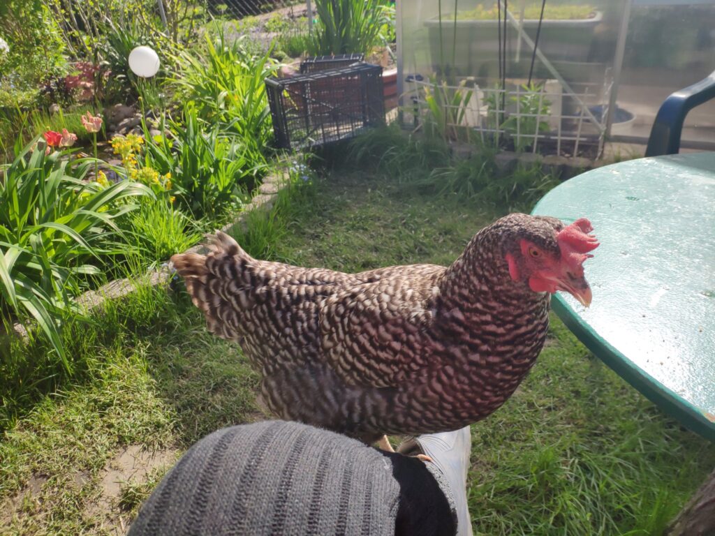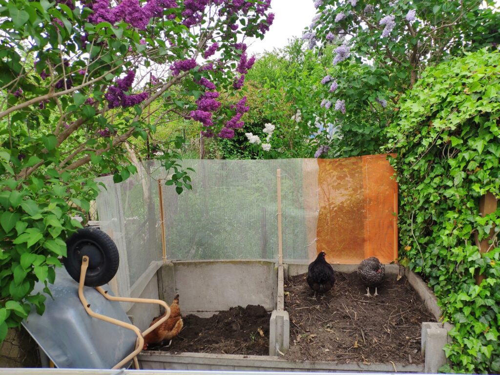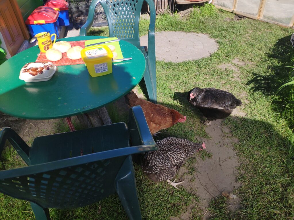 Czwarty tydzień przygody z kurkami. Nawet było jajko-niespodzianka. Na tygodniu któraś kurka zgubiła jajko ponadprogramowe, bo tego dnia były trzy normalne i to jedno „gumowe”. Oczywiście była z niego jajecznica ze szczypiorkiem. Od kilku dni zmieniła się nieco organizacja dnia pracy kurek. Przede wszystkim dostały do dyspozycji kompostownik. Na wszelki wypadek „osiatkowałam” go, żeby nie przyszło im do głowy przejść do sąsiedzkich kompostowników, albo wyjść na ogród. Ledwo je wypuszczę rano z kurnika już pędzą do kompostownika. Urzędują w nim, aż ja zasiądę do swojego śniadania. Głównie oczekują na skórki od chleba, a właściwie to je wyłudzają. Po swoim i moim śniadaniu kurki odpoczywają i łypią od czasu do czasu okiem, czy ze stołu coś nie spadnie. Pierwsza do gniazdka zasiada Jarzębata, za nią Czerwona, a na końcu Czarna. I taka jest kolejność od kilku dni. Dostaję od nich 3 jajka. Białe jajko znosi Czerwona. Produkcja trwa do południa, po czym jest drugi odpoczynek i kąpiel w piaskownicach z popiołem. Jeszcze przed spaniem zaliczają kompostownik. W kurniczku też już mają swoje miejscówki. Jarzębata i Czerwona śpią na grzędzie w sypialni, a Czarna na grzędzie przed gniazdkiem. Początkowo był z tym problem, ale ostatecznie kurki porozumiały się, że takie rozwiązanie jest najlepsze. Jarzębata i Czerwona kumplują się, potrafią Czarną dziobnąć, więc Czarna śpi odwrócona do nich tyłem.
