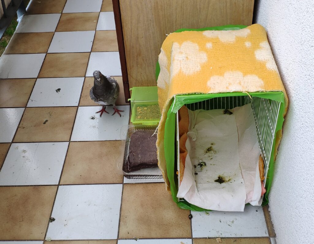 Po drugiej stronie ulicy „pasły się” gołębie. Przeniosłam go do nich z myślą, że może podejdą do Leona. Gołębie odfrunęły, a Leon nie widząc swojej miejscówki uciekł w krzaki. No to się narobiło! Pomoc dzieci była niezbędna, ale przy okazji Leon trochę poćwiczył biegania. Na szczęście nie protestował, gdy niosłam go na drugie piętro, tylko serduszko mu bardzo mocno biło. Pewnie się zmęczył, ale my także.