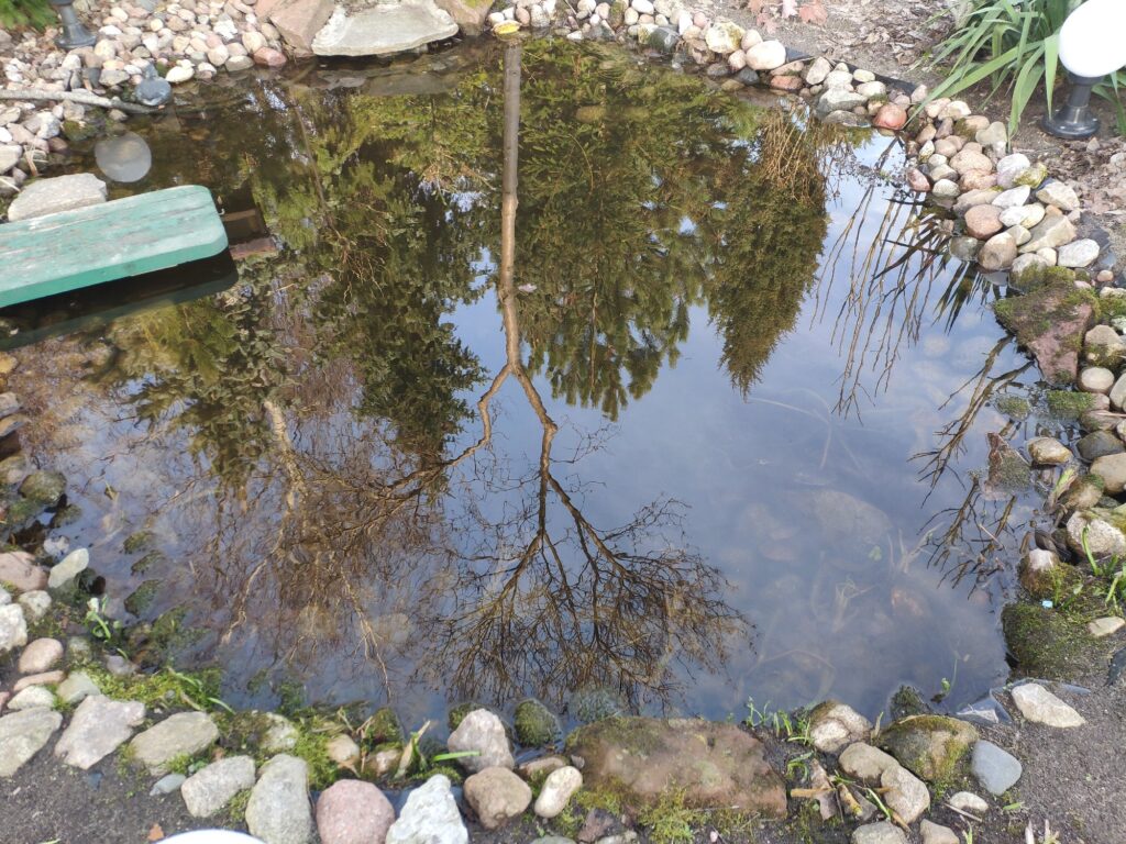 Było 8 ℃. Piękna słoneczna pogoda. Woda w oczku jak kryształ, prawdziwe lustro. Stałam na zielonym mosteczku i przyglądałam się rybkom, które też wyszły na spacer. Nagle usłyszałam jakieś dziwne odgłosy, wręcz krzyki wołające na ratunek. Rozejrzałam się dokoła, bo myślałam, że to może kot upolował jakiegoś ptaka. Ale gdy przypadkowo spojrzałam w niebo, zobaczyłam piękny klucz (chyba gęsi). To one tak głośno krzyczały. Za późno było na zrobienie zdjęcia. Przeleciały nad naszym ogrodem w kilkanaście sekund.