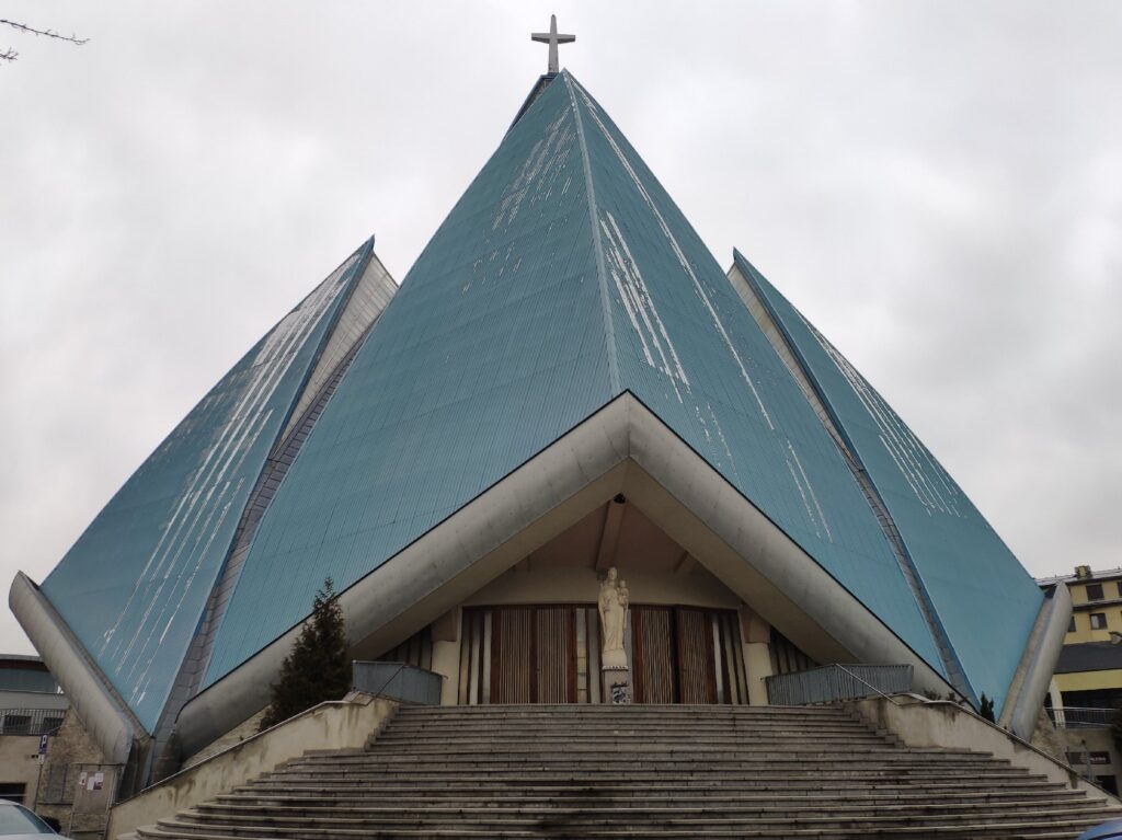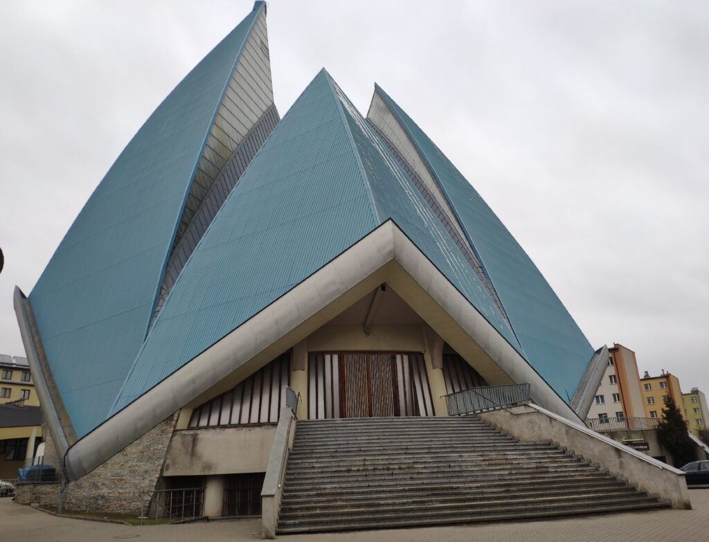 Nowoczesny kościół został zbudowany wg projektu arch. Wojciecha Gęsiaka i arch. Wojciecha Fałata.Wojciech Gęsiak w latach 1990 – 1994 pełnił funkcję prezydenta Radomia.