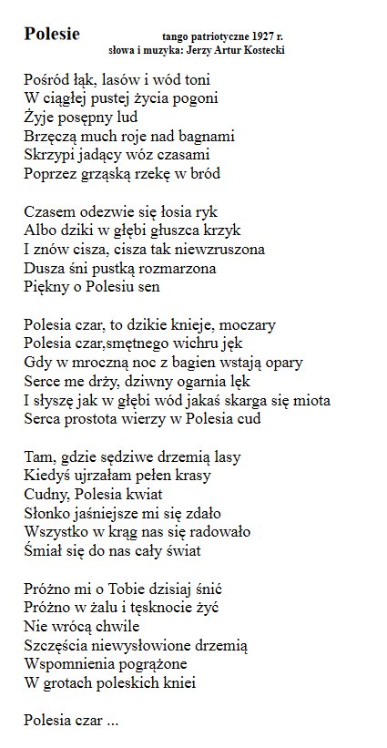 Piosenka „Polesie” – tango z 1927 roku, które autorem tekstu i muzyki jest Jerzy Artur Kostecki opisuje Polesie. W szczególności polecam wykonanie tej piosenki nieznanej polskiej grupy wokalnej na emigracji w USA. lata 1950-te.