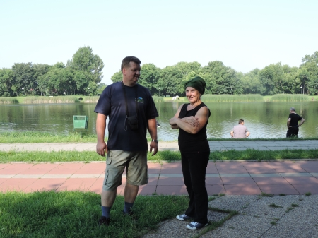 A Stary Ogród w niczym nie przypomina starego ogrodu. W ogrodzie trwają prace modernizacyjne. Staw z piękną fontanną już dodaje uroku, ale niestety klony obłożone oponami – niekoniecznie. Tym bardziej, że te opony służą za kosze na śmieci, gdyż wykonawca robót nie przewidział, że radomianie, mimo iż ogród jest w remoncie, potrzebują tu przychodzić. Kosze na śmieci są więc niezbędne. Zniknęło wiele drzew, pewnie wraz z nimi wiele wspomnień. Na zdjęciu moja przyjaciółka Halina Fatek (z prawej strony) w Starym Ogrodzie.