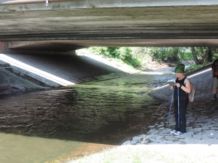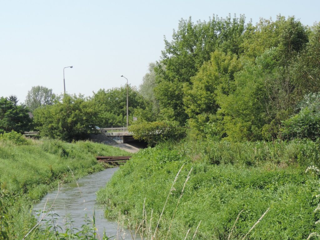 Po tym krótkim asfaltowym odcinku zaraz za Potokiem Północnym schodzimy do koryta rzeki i jej prawym brzegiem będziemy iść dalej. Chaszcze, pokrzywy, ale koryto rzeki ładnie uregulowane i …kaczki. Płyną w dół rzeki, jakby chciały nam towarzyszyć w dalszej wędrówce – od razu przyjemniej. Cały czas trzymamy się koryta i kaczek, tylko w jednym miejscu prywatna posesja przykleiła się do rzeki i musimy ją obejść. Ten cichy, miły w towarzystwie kaczek spacer niestety nie potrwał długo. Z prawej strony zaczął dochodzić do nas straszny hałas. Ale to straszny. Tomek wyjaśnił, że to gokarty. W pobliżu, gdzie kiedyś była giełda samochodowa teraz jest tor gokartowy. Szum większy niż na autostradzie. Okropnie się szło, zanim odeszliśmy od tych gokartów. Po drodze minęliśmy dwa Rodzinne Ogrody Działkowe. Po lewej stronie rzeki „Poziomkę”, po prawej „ Truskawkę”. Współczuję działkowiczom.