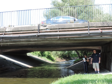 Wracając jednak do naszej wędrówki – wzdłuż tej siatki pokonujemy wysoką skarpę i zatrzymujemy się na chwilę pod mostem, następnie wydostajemy się na ul. Stefana Czarnieckiego. Niestety nie możemy przejść na drugą stronę ulicy, by być bliżej rzeki. Najbliższe wyznaczone przejście jest dopiero przed rondem Narodowych Sił Zbrojnych potocznie zwanym rondem warszawskim.