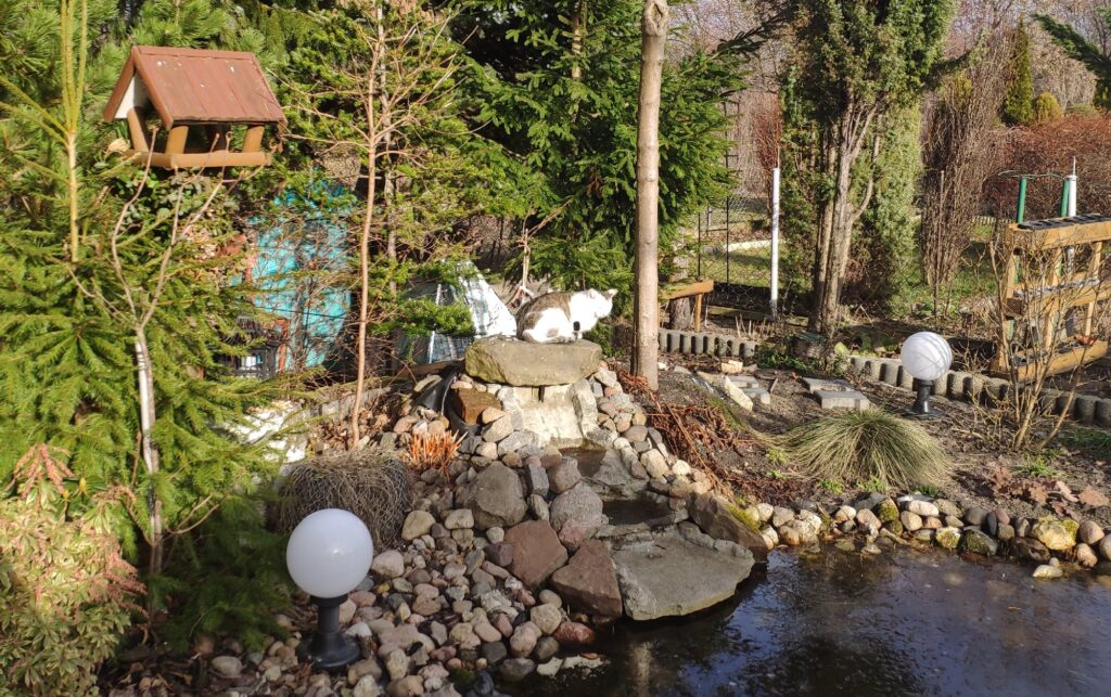 Dzisiejsza niedziela bardzo przyjemna. Słoneczko i 5 stopni na plusie. Nawet kot znalazł sobie miejscówkę na wygrzewanie się, bo o polowaniu na rybki może na razie tylko pomarzyć, gdyż woda w stawiku jeszcze zamarznięta.