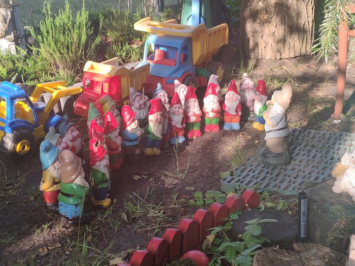Szkaradkowe krasnale wczoraj zakończyły rok szkolny, a dzisiaj od rana planują z Panem Profesorem wakacje. Nie udało mi się podsłuchać co planują, ale chyba gdzieś bardzo daleko, może jeszcze dalej niż na koniec świata. Może mają w planie jakąś pielgrzymkę? Myślę tak dlatego, ponieważ nie mają na plecach swoich plecaków, natomiast już są podstawione samochody. Pewnie na te plecaki?