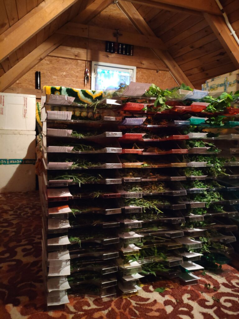Plastikowe szufladki na dokumenty, które miały pójść na odpady segregowane, otrzymały swoje drugie życie. Jeszcze nie wszystkie są wykorzystane, bo i zioła nie wszystkie zebrane. Czeka tymianek, lipa itp. Tymczasem zielnik nieco opustoszał, ale niebawem znów się zazieleni.