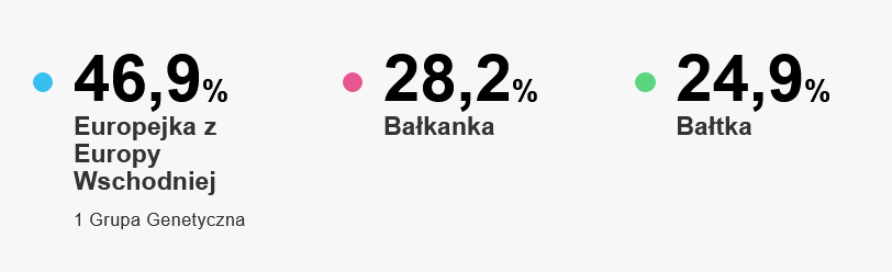 MyHeritage zbadało moje DNA. Grupa genetyczna – Polska. Z badań etnicznych wynika, że w połowie jestem Europejką z Europy Wschodniej, w jednej czwartej Bałtką (po matce) i w jednej czwartej Bałkanką (po ojcu, którego tożsamości dotychczas nie poznałam).