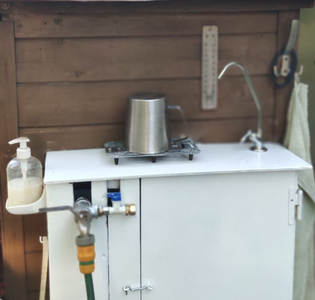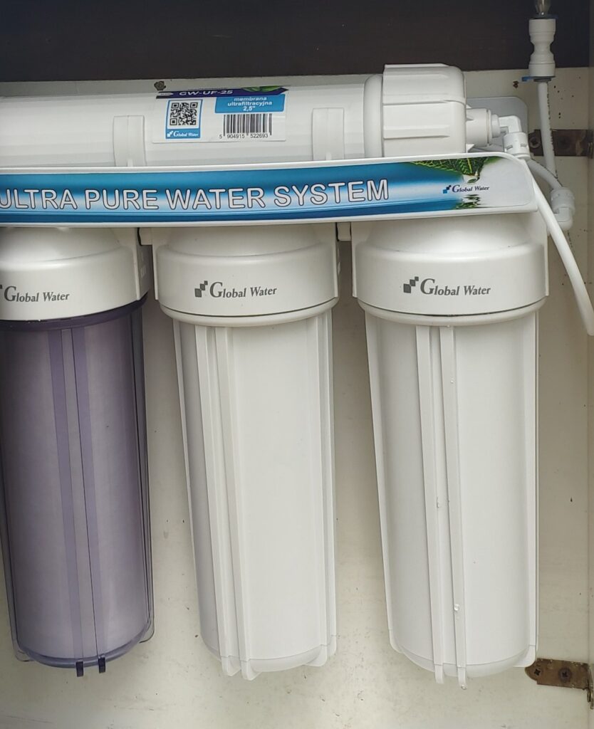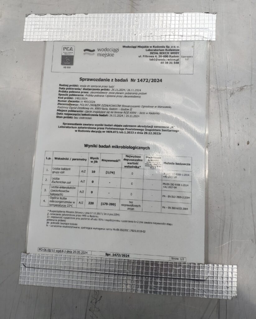 Sytuacja bardzo mnie zaniepokoiła nawet do tego stopnia, że przeprowadziłam rozeznanie o szkodliwości wody skażonej tą bakterią i zgłosiłam swoje uwagi do Zarządu ROD z sugestią zamknięcia studni do czasu jej oczyszczenia. Jednak moje uwagi nie zostały przyjęte, więc przestałam korzystać z „dobrodziejstwa” naszej studni. Przestawiałam się na wodę ”muszyniankę” i na „kranówkę” z domu. Trudno, że dodatkowy ciężar. I ten właśnie dodatkowy ciężar zrodził pomysł na własne źródełko pitnej wody. W ogrodzie mamy sieć wodociągową. Mamy hydrofornię po remoncie – nowoczesną. Wykonawca remontu zasugerował, że gdybyśmy zainstalowali filtry, to mielibyśmy świetną wodę do picia. Ale wtedy jeszcze nie było tego „tematu”, gdyż działała nasza studnia. Wodociąg w naszym ROD jest aktywny w sezonie działkowym, a wyłączany na okres zimowy. Woda jest pobierana z głębokości 39 metrów. Wcześniejsze badania tej wody wykazały nadmierną zawartość żelaza, czyli do celów spożywczych należałoby ją filtrować. W takiej sytuacji postanowiłam, że we własnym zakresie założę filtr do tej wody, ale na swojej działce i na własny użytek. Koszt nie był aż tak wielki – dla mnie do udźwignięcia. Wykonaniem nowej inwestycji tradycyjnie zajął się mój małżonek. Dobrał odpowiedni filtr, zaprojektował i wykonał własnoręcznie szafkę.