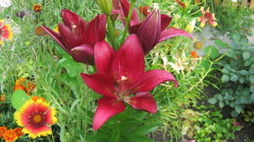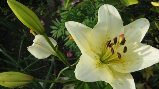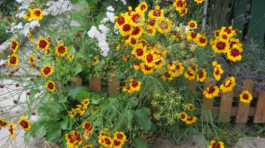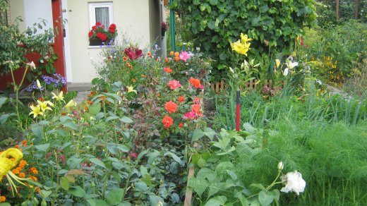W kamionce małosolne ogóreczki. Przykrywam je woreczkiem foliowym wypełnionym wodą, żeby nie wypływały. Dawniej był to talerzyk przyciśnięty kamieniem. Jednak woreczki okazały się sprytniejsze. Można je częściej wymieniać na nowe. W słoikach półlitrowych sukcesywnie kwaszę ogórki na zimę z dodatkiem estragonu i liścia wiśni. Patisony i cukinie urosły na kompostowniku. Z czarnej porzeczki mam sok, a wytłoki czarnej porzeczki użyłam do wina z czerwonej porzeczki. Fasolka szparagowa w tym roku dobrze obrodziła. Już jest w zamrażarce. Wykopuję ziemniaki. Czyli … niedługo w ogrodzie będzie jesień. Tymczasem cieszę się jeszcze widokiem moich kwiatów.