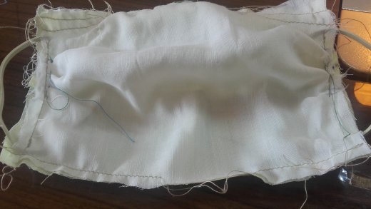 Tak wygląda zszyta maseczka po lewej stronie. Teraz należy maseczkę przewrócić na prawą stronę przez dolny otwór.