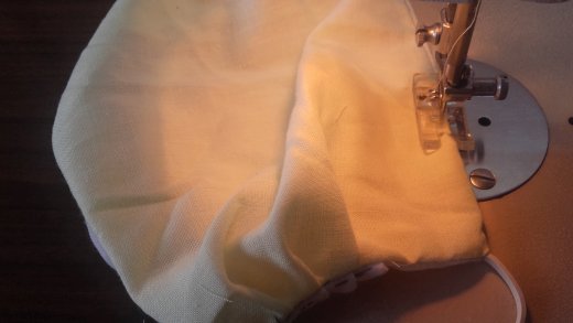 Teraz przeszywamy dolny brzeg maseczki przez całą długość zszywając jednocześnie otwór przez który maseczkę przewracałam na prawą stronę