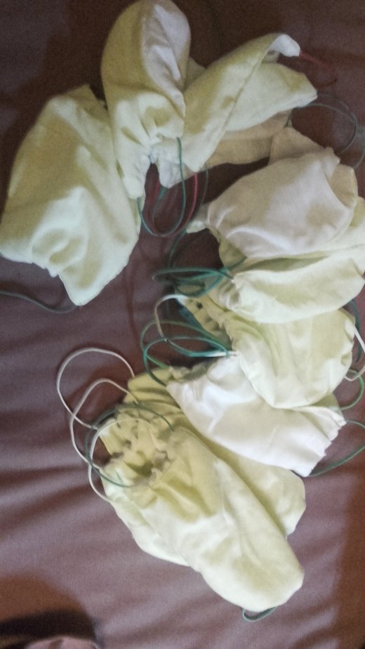 Podczas szycia maseczek dla domowników okazało się, że mam za mało gumki „majtkowej”. Pomyślałam o recepturkach. Uzbierało mi się ich sporo po matlesach. Małżonek jak kupuje jajka na targu to zawsze całą matlesę. Każda zabezpieczona jest 4 takimi gumkami. Gumka złożona na pół ma 11,5 cm długości i jest dość mocna. Szkoda mi było je wyrzucać.