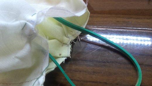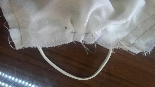 Zapomniałam wcześniej napisać o tym druciku. Ja użyłam druciku miękkiego nierdzewnego (po naszemu wiązałkowy) o śr. 0,8 mm. Można też użyć druciku powlekanego, którego używają działkowcy czy kwiaciarki (jest w zielonym kolorze). Drucik ma być długości 10 cm. Kombinerkami zaginam końcówki drucika na ok. 1 cm następnie wkładam go do taśmy izolacyjnej i go oklejam tą taśmą. Nadmiar taśmy odcinam, żeby nie był drucik za gruby. Tak przygotowanych 12 czy 14 drucików wsuwam po kolei do środka tuneliku (na nosek) jeszcze nie odcinając maseczek od siebie.