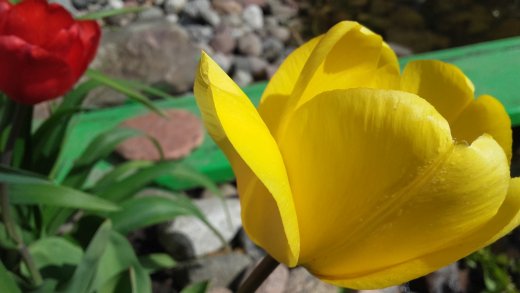 W tym roku mniej tulipanów. W pełnej krasie teraz żółte i czerwone.