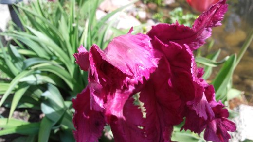 Fioletowe tulipany przy oczku wyrosły okazale.