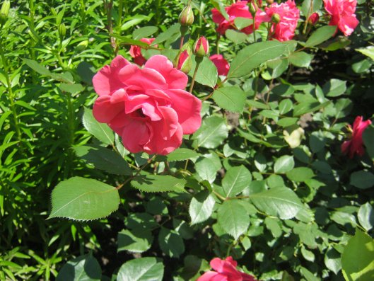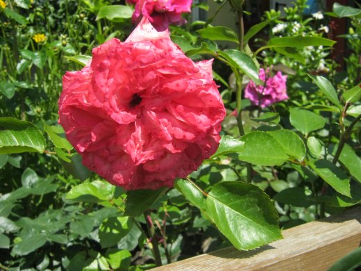 Czerwona pnąca róża pachnąca przy wejściu – doczekała się w tym roku nowej pergoli. Musiałam ją mocno przyciąć, ale już się ładnie prezentuje. Małe różyczki miniaturki posadzone w dwóch donicach i w jednym saganie też są piękne. Róże bukietowe mają swój płotek, żeby nie przechylały się zbytnio na warzywa.