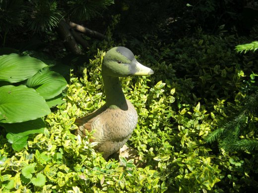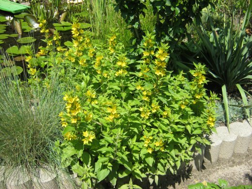 Przy oczku zaczynają rozkwitać liliowce.Pierwsze kwitły kaczeńce, potem tulipany, po nich zawilec ogrodowy, ostatnio kwitły żurawki. Stara ława z dębowych kloców z daszkiem na ścianie domku i podwieszoną surfinią oraz gęś w trzmielinie także przynależą do oczka, tak jak kaskada ze ślimakiem. Rododendronik dopiero kupiony już przekwitł.