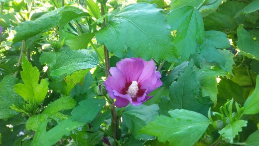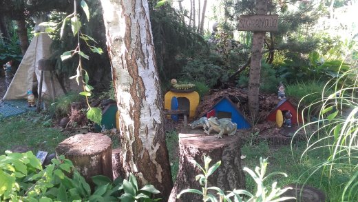 Chińska róża (niebieska) wyhodowane przeze mnie z nasionka wita mnie przy furtce. Biała, też przeze mnie wyhodowana, króluje nad oczkiem.